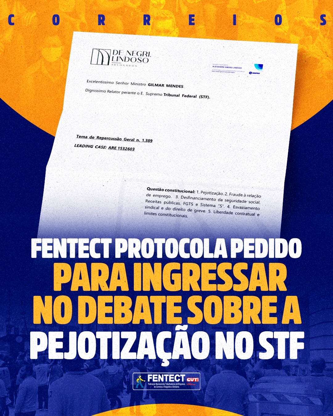 A FENTECT protocolou pedido de ingresso como amicus curiae no STF para enfrentar, de forma firme e responsável, a ofensiva da pejotização no país. A...