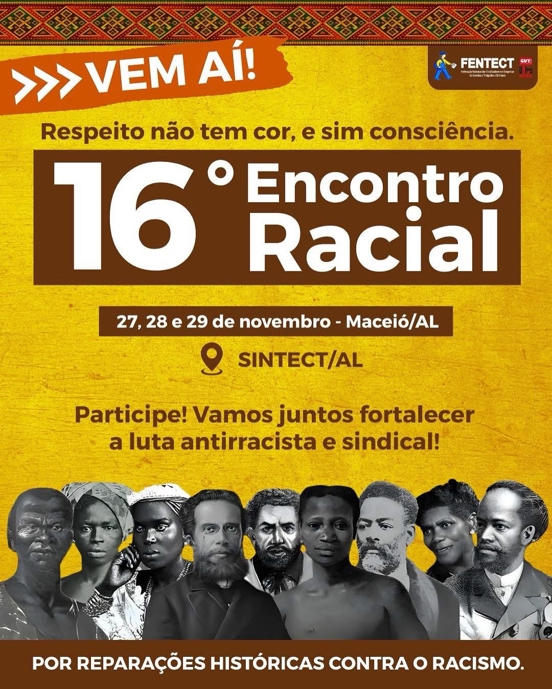 Convocamos toda a categoria e as lideranças sindicais a estarem presentes no 16º Encontro Racial da FENTECT, que será realizado entre os dias 27/11 e 29/11, no SINTECT/AL em...